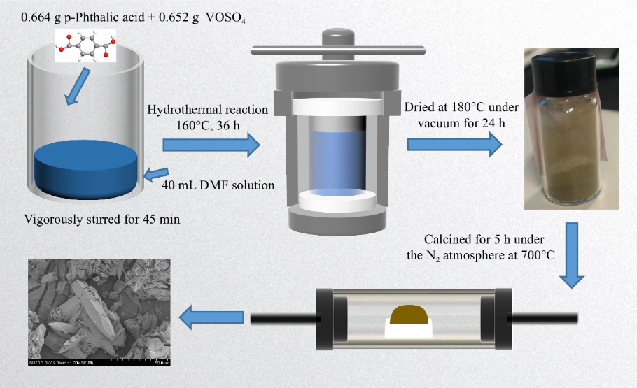 采用簡(jiǎn)單的水熱反應(yīng)和煅燒法制備了具有子彈狀結(jié)構(gòu)的釩基MOFs材料。首先,將0.652 g硫酸釩氧化物水合物(VOSO4,Alfa,純度99.9%)和0.664 g對(duì)苯二甲酸(Alfa,純度98%)溶于45 mL二甲基甲酰胺(DMF,Alfa,純度99.8%)溶液中,在100 mL不銹鋼高壓釜中劇烈攪拌45分鐘。160°C保溫36 h后用甲醇洗滌8次,離心后將得到的固體在180°C真空干燥24 h,最后在700°C N2氣氛下煅燒5 h,便能得到釩基MOFs材料。