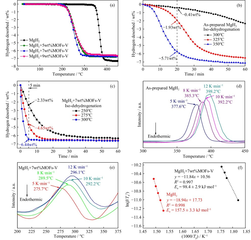 圖2. (a) MgH2+xwt%MOFs-V (x = 0, 5, 7, 9)的非等溫放氫曲線。(b) MgH2在300、325、350°C的等溫放氫曲線。(c) MgH2+7wt%MOFs-V復(fù)合材料在250、275、300°C的等溫放氫曲線。(d)制備的MgH2和(e) MgH2+7wt%MOFs-V復(fù)合材料的DSC曲線。(f) MgH2和MgH2+7wt%MOFs-V復(fù)合材料的基辛格圖。