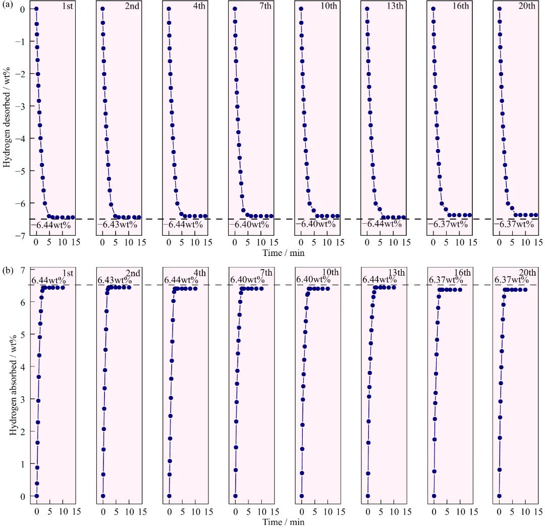 圖4為MgH2+7wt%MOFs-V復(fù)合材料在300°C下的循環(huán)曲線。復(fù)合材料在第一次循環(huán)中釋放了6.44wt%的H2,在第十次脫氫實(shí)驗(yàn)中仍然釋放了6.40wt%的H2。在第20個(gè)周期中,MgH2+7wt% MOFs-V復(fù)合材料解吸了6.37wt%的H2,與第一次循環(huán)相比,保持了98.9%的儲(chǔ)氫榮量。