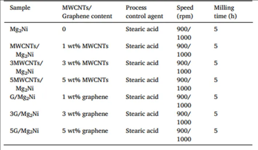 首先稱取45.3g鎂粉、54.7g鎳粉和3g硬脂酸(用作過程控制劑)。為了平衡Mg在球磨過程中的損失,額外添加4wt %的Mg,然后均勻混合并放入高能球磨機中。為了防止球磨過程中的氧化,在氬氣保護氣氛下進行了研磨。球料比為15∶1,采用3mm不銹鋼球,球磨機以900r/min和1000r/min的速度交替運行,研磨時間為5h。在球磨過程中使用循環(huán)冷卻方式,使球磨腔溫度維持在35℃左右。使用石墨烯和MWCNTs對Mg2Ni合金進行復合改性。