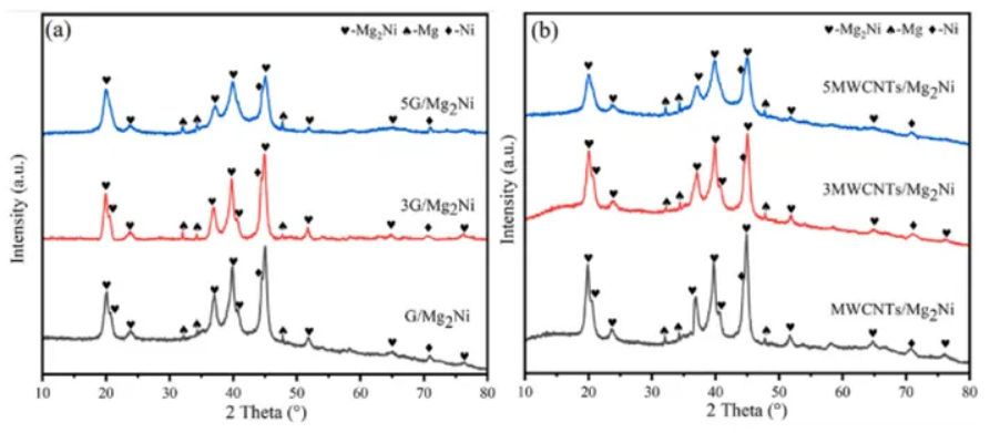 ①在球磨過程中,復合材料中石墨烯和MWCNTs含量的增加放大了其潤滑和助磨作用。這導致了晶粒尺寸的重新調(diào)整,并減少了團聚和焊接的情況。石墨烯和MWCNTs的引入在Mg2Ni合金顆粒的外部產(chǎn)生了表面缺陷,并為氫的吸收和解吸建立了通道,從而增強了儲氫動力學的動態(tài)行為。