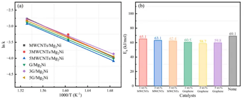 MWCNTs和石墨烯的結(jié)合有效地降低了Mg2Ni合金放氫反應所需的活化能,從而提高了放氫動力學效率。特別值得注意的是,在3wt%石墨烯復合材料中,激活能最低為58.7kJ/mol,與Mg2Ni合金相比降低了約10kJ/mol。這突出了合金放氫動力學最有效的增強。