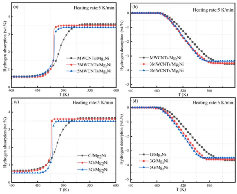當添加量為3wt%時表現(xiàn)出最佳的吸氫性能,在475K的溫度下,在200s內(nèi)迅速達到吸氫的飽和狀態(tài),在達到吸收溫度后表現(xiàn)出穩(wěn)健的吸氫動力學。隨著5wt%MWCNTs的引入,放氫飽和溫度為545K,放氫速率也略有上升。與MWCNTs樣品相比,3G/Mg2Ni在476K左右表現(xiàn)出更冷的吸氫量,具有更強的動力學特性,可以在150s內(nèi)快速達到吸氫飽和。